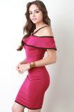 This off the shoulder bodycon dress features a flutter tier, v-shoulder straps, sculpture silhouette fit, and contrasting trimming. Accessory sold separately. Made in U.S.A. 62% Viscose, 33% Nylon, 5% Spandex.