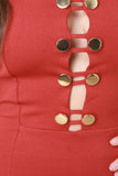 This midi dress features a sleeveless tube neckline, caged center with gold-tone buttons, princess seam, bodycon fit, and a vent slit at back hem. Accessory sold separately. 62% Viscose, 33% Nylon, 5% Spandex.