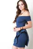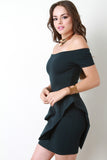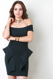 This off the shoulder dress features an elastic neckline, short sleeves, thick knit fabrication, bodycon silhouette, ruffle detail on hip and a mini length hemline. Accessories sold separately. Made in U.S.A. 65% Rayon, 30% Nylon, 5% Spandex.