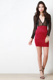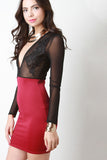 This bodycon dress features a contrasting twofer design, semi-sheer mesh fabrication upper half, a deep v-neckline, long sleeves, floral lace embroidery patch at breast, high waisted seam, to a sculpture fit skirt. Accessories sold separately. Made in U.S.A. 95% Polyester, 5% Spandex. Contrast: 100% Nylon.