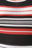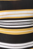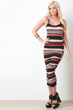 This sleeveless midi dress features a scoop neckline, horizontal stripes on ribbed knit fabrication, elasticized ruched sides, and sculpture fit. Accessories sold separately. Made in U.S.A. 60% Polyester, 35% Rayon, 5% Spandex.