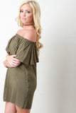 This relaxing shift dress features a woven fabric, elasticized off the shoulder neckline, ruffle detailed, and mini-length hemline. Accessories sold separately. Made in U.S.A. 100% Polyester.