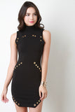 This bodycon dress features stretch fabric, mock neck, sleeveless construction, grommet accents, and side slits. Accessories sold separately. Self: 97% Polyester, 3% Spandex.