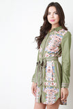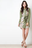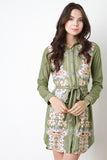 This long sleeve dress features vegan suede fabrication, button-up front to a collar neckline, floral pattern print, and a self tie sash at waist. Accessories sold separately. 100% Polyester.