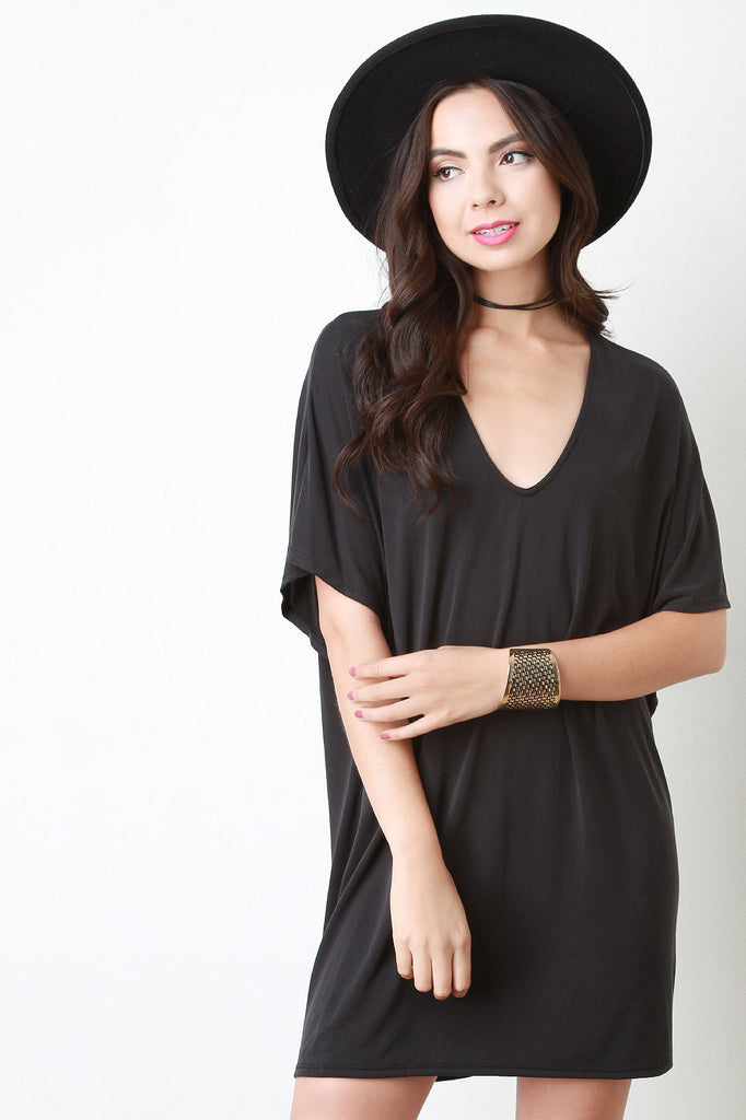 This casual dress features a jersey knit fabric, deep v-neckline, dolman sleeves construction, and mini-length hemline. Finished with a relaxing fit. Accessories sold separately. Made in U.S.A. 75% Modal, 25% Polyester.