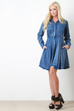 This midi dress features chambray denim, button up front, long sleeves, a-line cut, and frayed hem. Accessories sold separately. 70% Tencel, 30% Cotton.