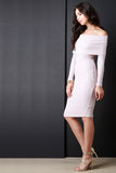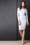 This cozy dress features a ribbed knit fabrication, wide band off the shoulder neckline, longsleeve construction, and midi-length hemline. Accessories sold separately. Made in U.S.A. 95% Rayon, 5% Spandex.