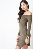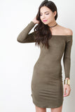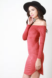 This casual dress features a vegan suede fabric, longsleeves construction, bardot neckline, and mini-length rounded hemline. Accessories sold separately. Made in U.S.A. 90% Polyester, 10% Spandex.