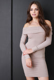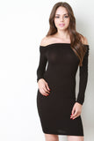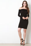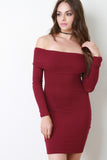 This bardot bodycon dress features soft rib knit, foldover off the shoulder neckline, and long sleeves. Accessories sold separately. Made in USA. 100% Polyester.