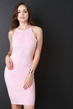 This bodycon dress features faux suede, round neckline, self-tie spaghetti straps, open back, and midi length. Accessories sold separately. Made in USA. 100% Rayon.