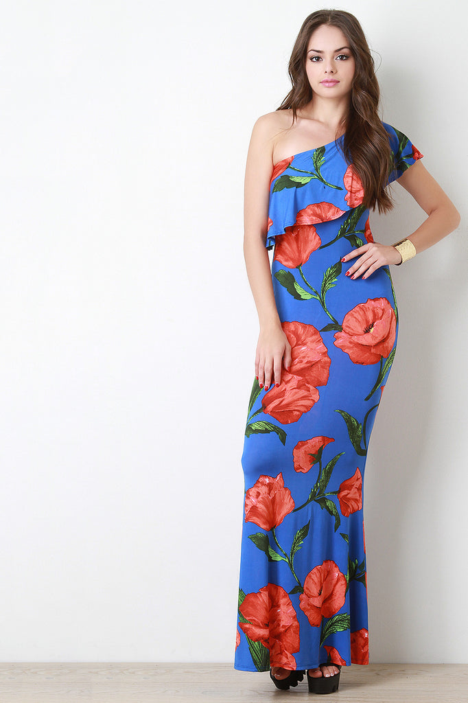 This cutesy dress features a smooth stretchy knit fabric, one shoulder design with ruffle detail, floral print pattern, and mermaid cut. Finished with a maxi-length hemline. Accessories sold separately. Made in U.S.A. 95% Polyester, 5% Spandex.