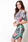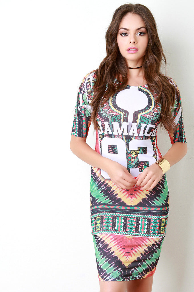 This bodycon dress features a smooth stretchy knit fabric, tribal print throughout, jamaica 93 graphic, boat neckline, and short sleeves. Finished with a mini-length hemline. Accessories sold separately. Made in U.S.A. 95% Polyester, 5% Spandex.