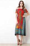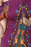 This midi dress features a woven fabric designed with dashiki print, smocked upper part, elasticized off the shoulder neckline, and short sleeves. Accessories sold separately. 100% Rayon.