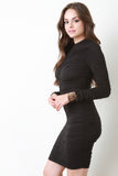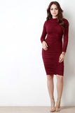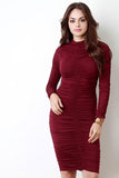 This stylish dress features a soft knit fabrication, mock neckline, long sleeves, and all-around ruched design. Finished with rear zip-up closure and mini-length hemline. Accessories sold separately. Made in U.S.A. 95% Polyester, 5% Spandex.