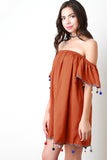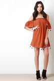 This fun shift dress features a woven fabrication, off the shoulder neckline, short bell sleeves, flowy shift dress silhouette, with a ribbon trim and beaded pom pom tassels on the hem and sleeves. Accessories sold separately. 100% Polyester.