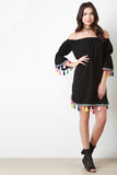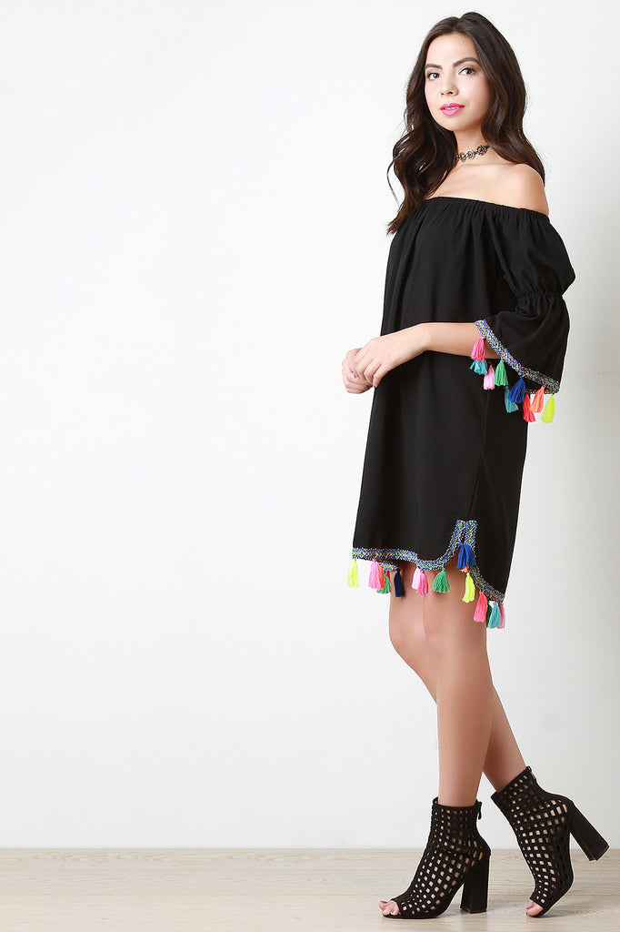 This casual dress features a woven fabrication, off the shoulder neckline, elastic band flare sleeve, flowy shift dress silhouette, with a neon woven trim and colorful neon tassels. finished with a rounded hem. Accessories sold separately. 100% Polyester.