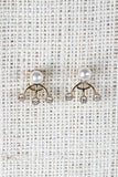 These jacket earrings feature a faux pearl stud and a three-pronged jacket with rhinestone ends.