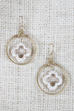 These fun earrings feature a wire wrapped circle design, with a faux stone quatrefoil bead, and french hook backs.