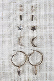 This earring set features 4 post back earrings with 1 pair of post and latch closure hoop earrings with a charm.