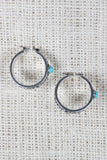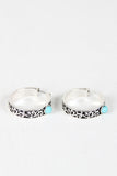 These bohemian inspired hoop earrings feature an engraved filigree design, single turquoise stone detail, and latch closure.