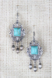 These boho inspired earrings metal dangle charms, square turquoise stone embellishments. Finished with fish hook backs.