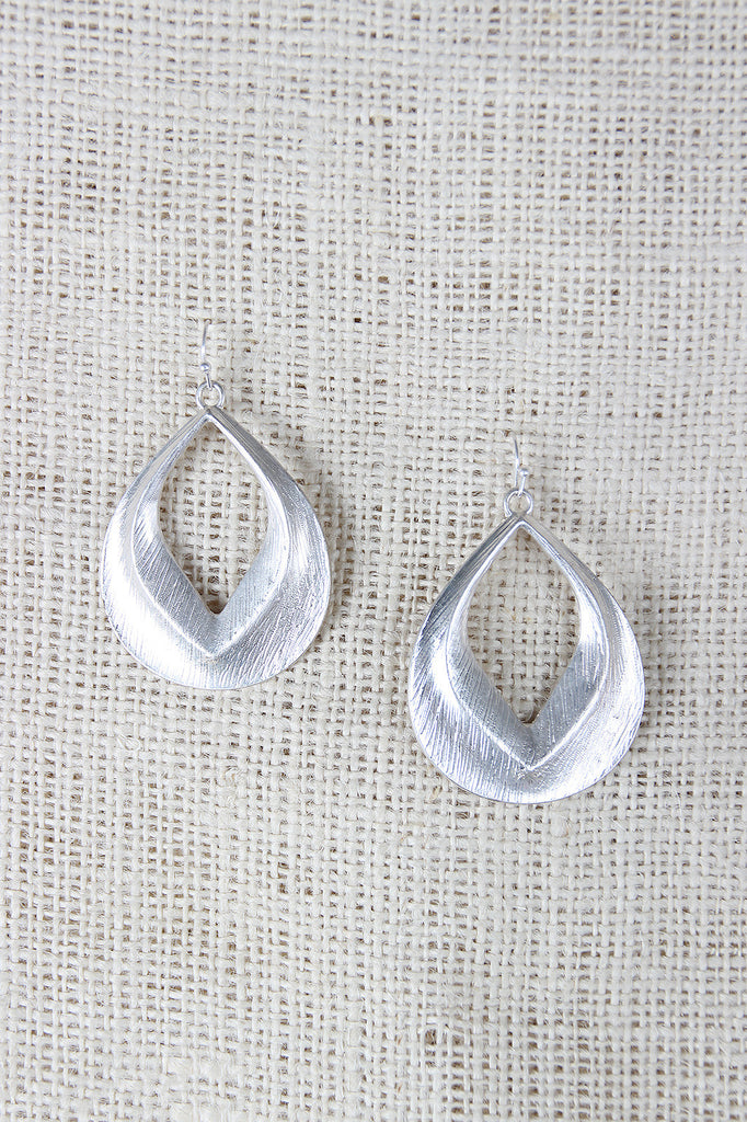 These earrings features a brushed metal and textured design, open tear drop shape and french hook backs.