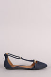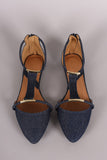 This stylish pointy toe silhouette, T-strap with gold-plated hardware detailing, and open shank construction. Finished with a lightly padded insole and convenient back-zip closure.