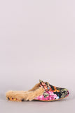 This trendy floral print flat features a slide style loafer mule hybrid, floral print fabric fabrication, faux fur lining, classic metal embellishment, low wrapped heel and a lightly padded insole for comfort.