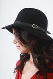 Featuring a wool main, pinched front, leatherette strap, and round brim. 100% Wool.
