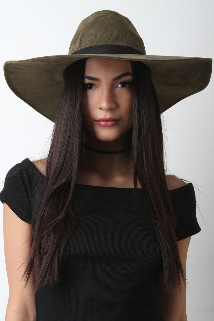 This chic hat features vegan suede, wide brim, and a black grosgrain ribbon band.