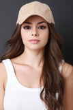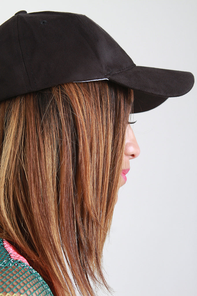 This cap has a classic baseball cap design, featuring 6-panels and curved brim. Adjustable strap at back. Vegan suede fabrication. 100% Acrylic.