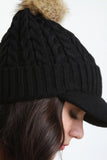 This beanie features a cable and rib knit fabrication, short bill in front, cuffed hem and a fur pom pom on top.