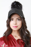 This hat features a classic six panel design, vegan leather fabrication, removable snap on faux fur pom pom and adjustable snap back closure.