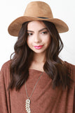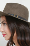 This hat is fedora silhouette; featuring, a pinched crown, wide brim, and a decor belt trim. Finished with an interior ribbon lining. 100% Polyester.