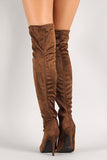 These over the knee boots feature a vegan suede upper, stitching detail, pointy toe, stiletto heel, and side zipper closure for easy on/off.