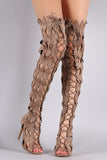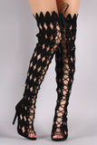 These stunning boots feature a soft vegan suede upper with geometric cutouts, corset-style lace up front, peep toe silhouette, and wrapped stiletto heel. Finished with an asymmetrical cuff, lightly padded insole, and full-length rear zipper closure.
