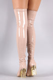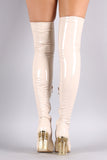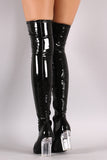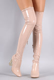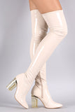 These over-the-knee boots feature a shiny vegans patent leather upper and chunky lucite heel. Finished with a cushioned insole, smooth fleece lining, and partial side zipper closure for easy on/off.