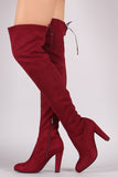These boots are over the knee silhouette with a slouchy shaft and a self tie string at top opening. Features a small length zipper along the inner side. Almond toe. Finished on a chunky heel.