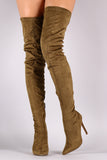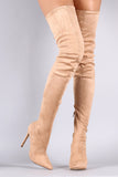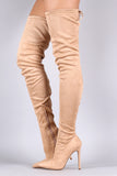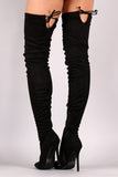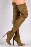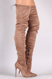 These eye-catching boots features a pointy toe silhouette, slouchy shaft, over the knee fit with self-tie string closure at back, and wrapped stiletto heel. Finished with a partial side zipper, smooth lining, and cushioned insole for comfort.