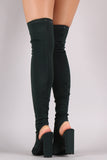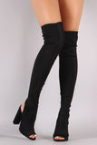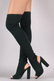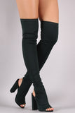 These over the knee boots feature a stretchy form-fitting fabric upper, peep toe design with an exposed back, and chunky heel. Finished with a lightly padded insole and pull-on style.