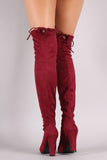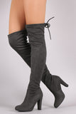 These over the knee boots feature a soft vegan suede, chunky wrapped heel, rounded toe, and a drawstring collar that ties at the back for custom fit. Pull on construction.