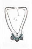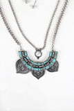A double layered necklace featuring curb link chain, jointed faux turquoise bars with tribal texture petals, and faux marble stone pendant. Necklace is finished with an adjustable lobster hook closure and includes matching earrings. Lead, cadmium, and nickel tested.