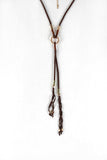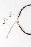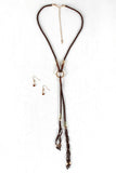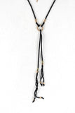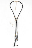 This braided vegan leather cord necklace features a twisted o-ring detail with long braids, tassel accent, and glossy metallic cube beads. Matching earrings feature a drop chains with beads detail and french hook back.