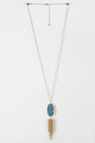 This necklace features a crystal filled oval pendant, with a chandelier style tassel, thin rope chain finished with an adjustable lobster claw closure.