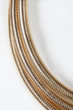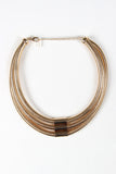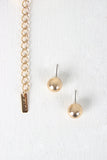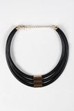 This edgy necklace features three oval shaped omega chains, high polished metal tube charm, matching earrings and an adjustable lobster claw closure.
