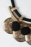 This statement necklace features a woven style cord, felted pom poms and round medallion charm, matching earrings, finished with an adjustable lobster claw closure.
