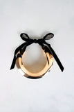 This sophisticated choker set features a curved and polished metallic cuff plate, self-tie wrap around vegan suede ribbon, and matching earrings.