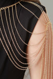 This body chain features a high polished finish, curb link chain necklace with thin open link chains draped over each shoulder, with an adjustable lobster claw closure.