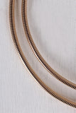 This collar necklace features a double snake chain, high polished metallic finish, wooden triangle block pendant, with an adjustable lobster claw closure. Includes matching earrings.