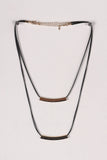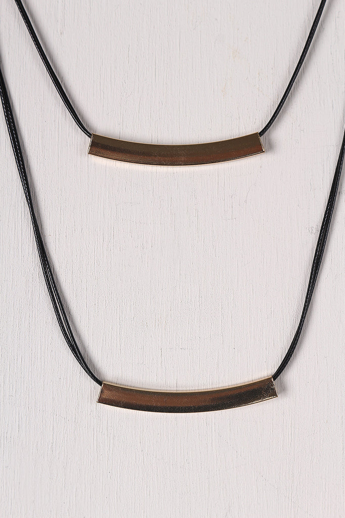 This necklace set features three separate necklaces, one wide vegan leather choker with a metallic gold triangle charm, and two thin waxes cord necklaces with gold bar charms. All have adjustable lobster claw closures.
